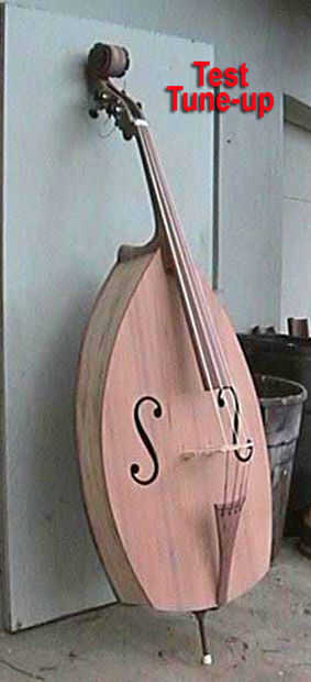 Por el tiempo que tenía la construcción completa me decidí a hacer una prueba puesta a punto antes de terminar, porque da una pieza de este tamaño una laca fina es un gran trabajo en sí mismo, y si esta cosa va a sonar como una mierda o implosión en el tendido, que así podría saber sobre él antes de sacar el equipo de pulverización. Hay una foto del bajo personalizados apoyado contra la puerta de mi taller.