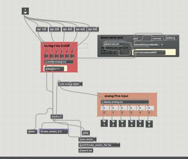Tercero: Haz el Arduino para hablar con Max Load file 'maxuino.maxhelp' seleccionar 'imprimir' y seleccione el Arduino en el menú desplegable. A su vez en los 'pines analógicos' mientras presiona el sensor de fuerza rellena las casillas número debe mostrar la salida de los sensores (entre 0.0 - 0.99). Guarde el parche. Nota: Puede borrar todas las entradas y SERVO del parche.