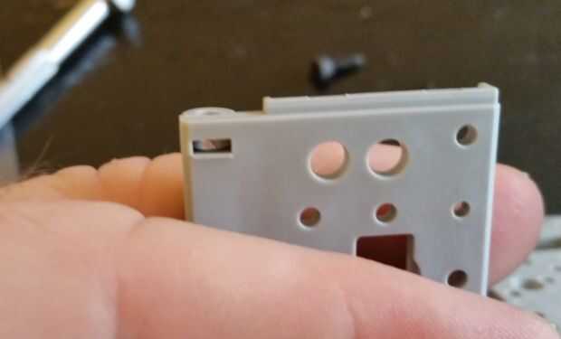 Ahora coloque dos tuercas N1 chuletas pequeñas para ellos en el marco de FP04. Luego poner el marco superior hacia el inferior y use dos pernos S2 para asegurar la parte superior del marco el servo a la base. Conecte uno de los cables de Dynamixel al servo y bajan a través del marco y hacia el lado.