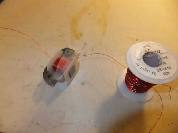 Escoger cualquier dirección (CW o CCW, no importa) y 28 bobina calibre alambre magneto desde el lado del electroimán que se adjunta al final del brazo. Mi core tuvo un C en un lado que hizo conveniente para zip escribiendo al final del brazo.