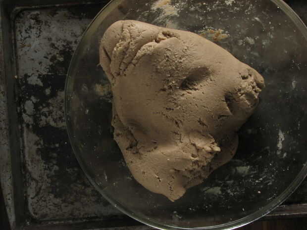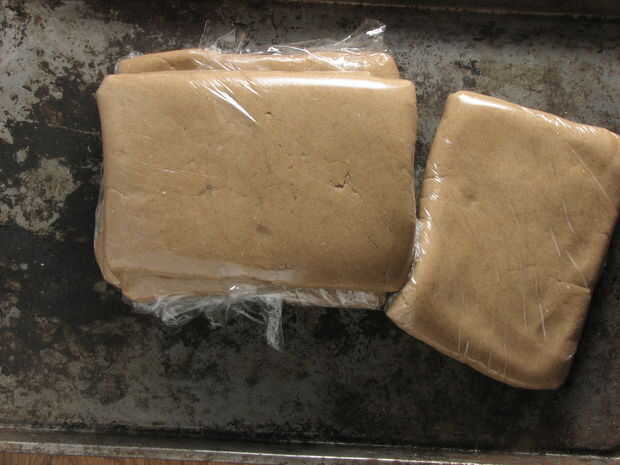 En un cuenco mezclador grande, bate la manteca junto con el azúcar y las especias. Raspar hacia abajo los lados del tazón de fuente hasta que la mezcla de manteca es totalmente homogénea. Añadir la harina unas tazas a la vez, mezclando después de cada adición. (Si está usando un uso de la batidora eléctrica la velocidad más lenta) Finalmente el acortamiento se mezcla completamente en la harina y parecerá arena just-apenas-húmedo. Verter la melaza y el agua y mezclar hasta que el líquido se distribuye a lo largo de la masa. La masa es muy dura, así que tendrás que amasarlo justo para obtener la masa entera se reúnan. Gire la masa una encimera y dividirla en tres partes. Uno por uno amasar cada porción de masa hasta que quede lisa y homogénea. Presione la masa en 1" espesor rectángulos y envolver bien en plástico. Dejar descansar una hora o así antes de que ruede (sólo dejándola a temperatura ambiente está muy bien). Si usted no se usarlo ese día, guardar la masa en la nevera, pero que hasta temperatura ambiente antes de rodar y darle forma.