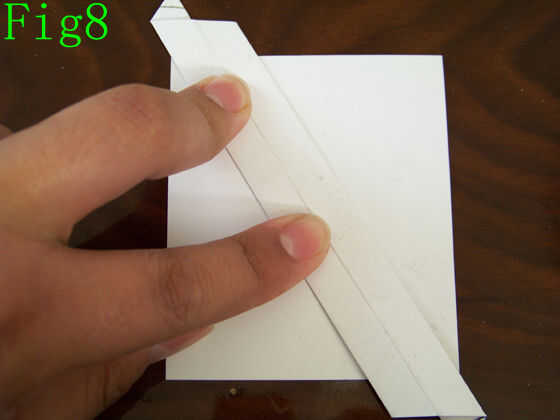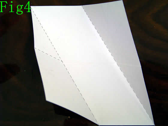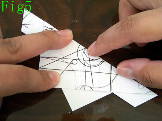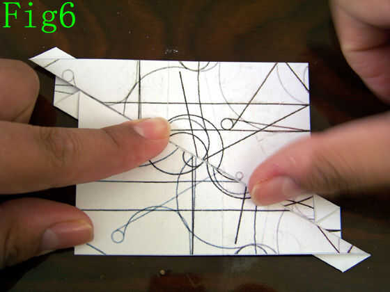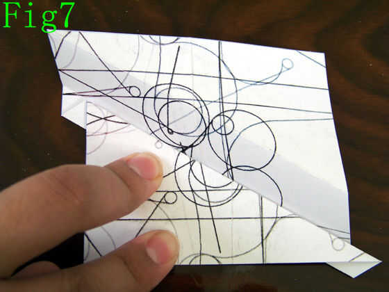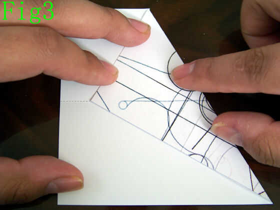 Entonces, desde la esquina inferior derecha, doble hasta la derecha de la esquina sobre el pliegue del centro. (Fig3)