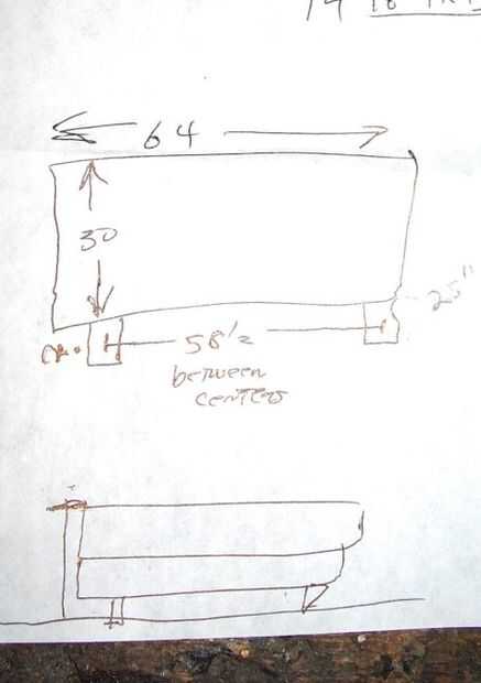 Como se puede ver en el dibujo crudo en la foto, mis planes no requieren habilidades de redacción ni ordenador. Que bosquejar las medidas para el cabecero, que para esta particular cama (queen size) resultó para ser 64" ancho, y el cabecero 30" pulgadas de altos y de estar en 25""patas". Los orificios para fijar al marco de la cama fueron de 58,5" entre los centros de las ranuras.