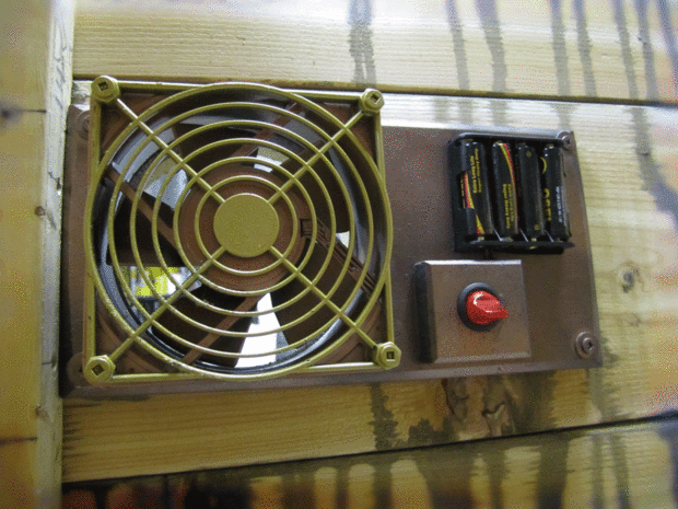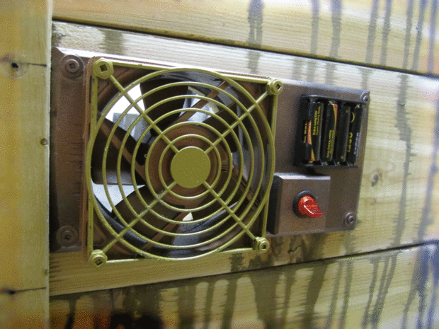 Casi se me olvida añadir ventilación para el hombre lobo dentro del cajón! Volví luego y añadir un ventilador de 12V que escurr 8xAA baterías y un interruptor (el interruptor es para que el hombre lobo puede apagarlo cuando un invitado se acerca - no quería que supiera que hay una sorpresa en la caja!).