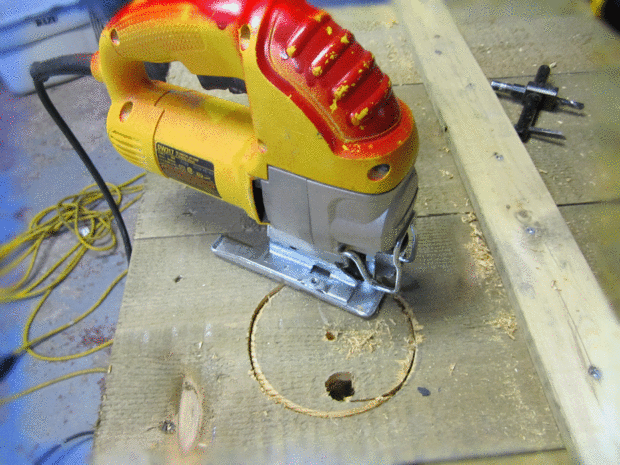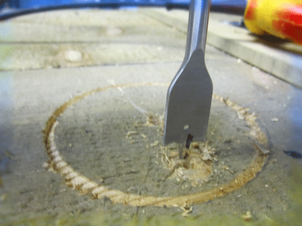Primero empecé a cortar un agujero con una broca del cortador de círculo en la parte posterior de la caja (donde no se notó por el huésped. Luego perforé un agujero con una broca de pala. Esto me permitió usar la sierra caladora para terminar cortar el agujero (este agujero tiene el mismo diámetro que el ventilador).