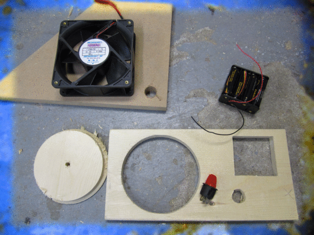 Para configurar el ventilador primero hice un rectángulo de una pieza de madera de 1 x 6. Corte el círculo donde ventilador iría, luego la caja de la batería y el interruptor. He añadido un pequeño pedazo de MDF a la base del interruptor porque es más gruesa que la madera que estaba usando.