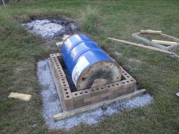 La espera es un buen momento para dividir su cañón en dos con una rueda de corte o sierra sable (tener cuidado y verificar qué contenidos estaban en el barril previamente y a líquidos inflamables, si es necesario, purgar barril con argón u otro gas no inflamables para mayor protección). Ahora y pruebe la colocación de su barril la mitad en su hoyo hombre. Prueba colocar ambas piezas como uno probablemente encajará mejor desde su difícil dividir perfectamente un barril a la mitad. Guardar la otra mitad como la vamos a utilizar para hacer un accesorio para el hoyo.