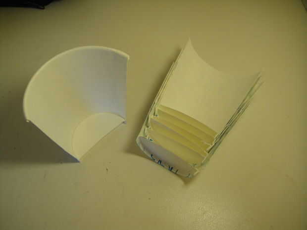 Con la Copa de un rotor alto no tiene suficiente área para el paso a paso motor a una velocidad de viento razonable por lo que necesita para hacer las copas un poco más altas. Tomar tres tazas cortadas por la mitad y cortar el borde de la parte superior. Cortan pequeños cartabones en las esquinas donde el borde estaba para ayudarles a adaptarse mejor