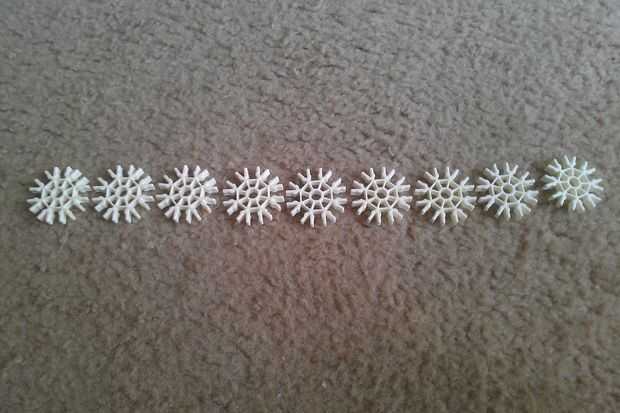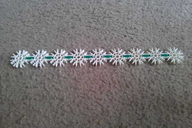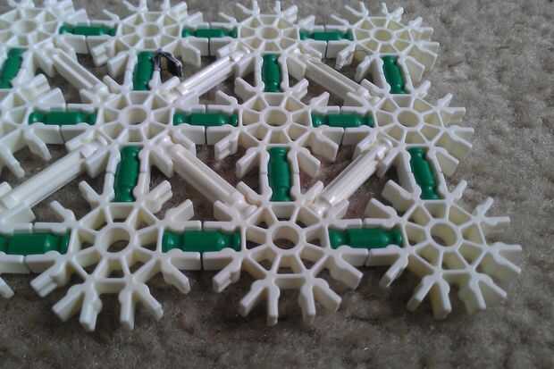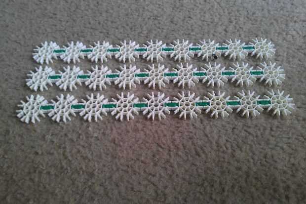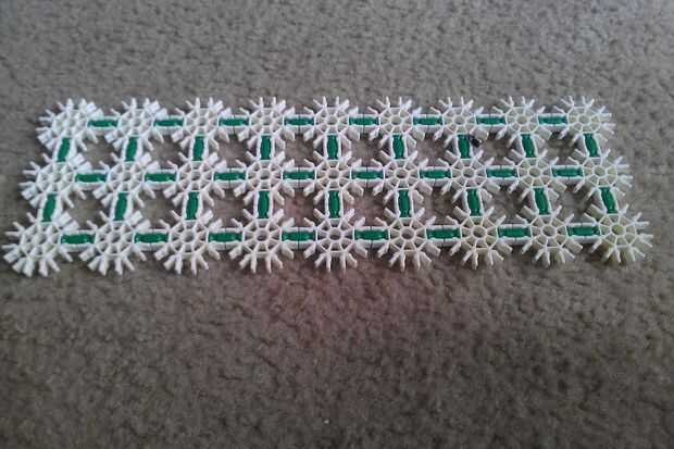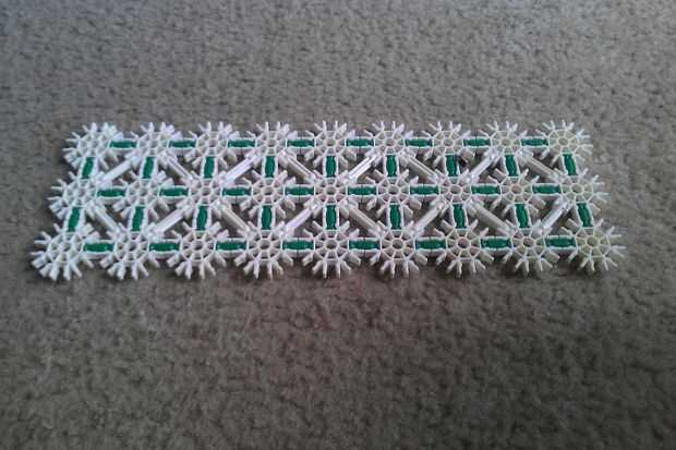 Tomar nueve blanco conectores y conectarlos mediante barras verdes. Repita el procedimiento para obtener tres piezas total. A continuación, conecte las tres piezas con barras verdes. Finalmente, rellene todos los espacios con barras blancas. Asegúrese de que las barras blancas son exactamente las mismas como en la imagen!