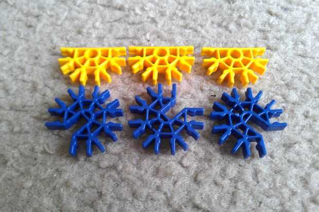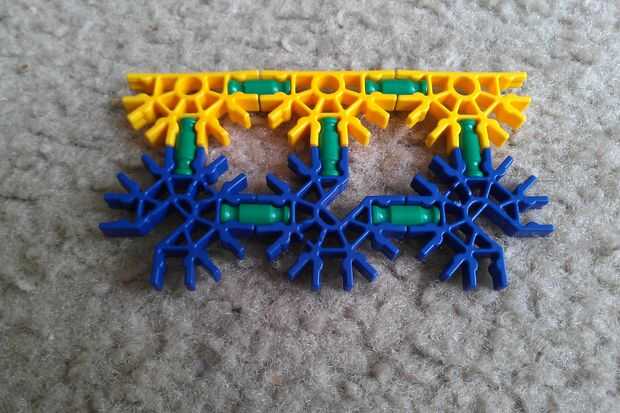 Tomar tres conectores amarillos y tres conectores azules y ponerlos exactamente como se muestra. A continuación, conéctelos usando barras verdes.