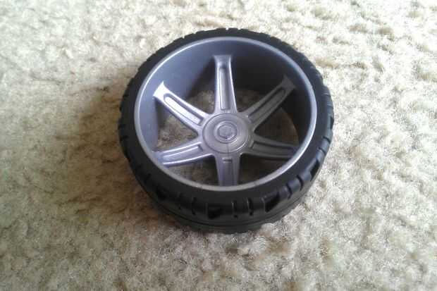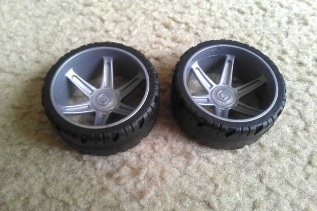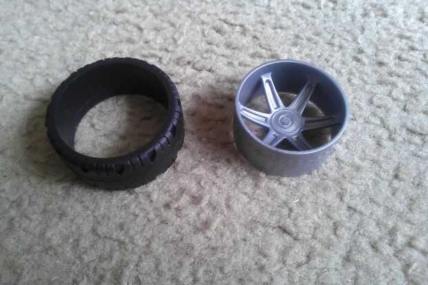 Toma un volante e insertarla en un neumático. Repita el procedimiento para obtener dos ruedas completas.