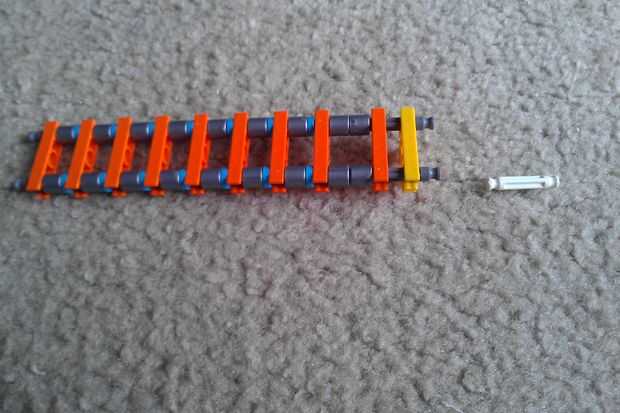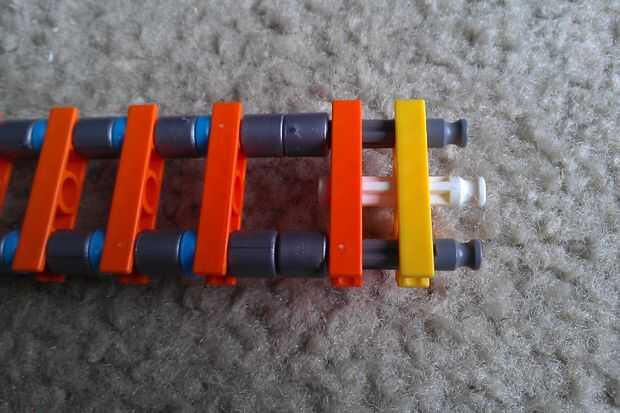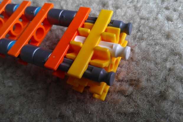 Agregar un conector amarillo para el final de la pieza de la manija. A continuación, inserte una varilla blanca a través de los conectores amarillo y el naranja primero. Luego, añada dos conectores más amarillos a la barra blanca. Deberían ser al revés del original conector amarillo.
