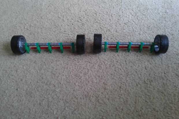 Repita los pasos 2-7 para obtener dos piezas rueda total. Aviso que los separadores van en direcciones opuestas en cada eje.
