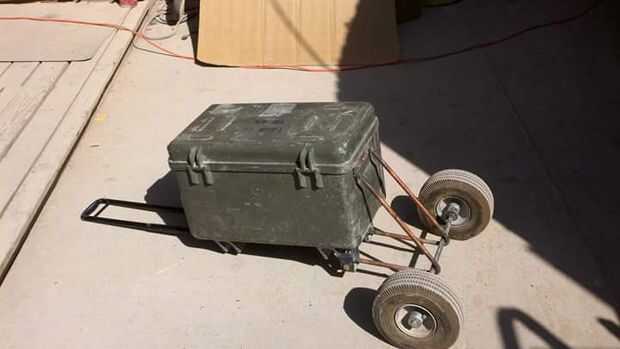 Me quité la manija y las ruedas existentes y empernada en algunos soportes de un kit de luz led universal para nuestros vehículos militares a continuación doblar las estacas de conexión a tierra y soldado el eje robinair así como un soporte para ser atornillado en los agujeros existentes donde va la manija en la parte superior de la soldadura. el extremo inferior soldados en tubo para encajar entre los soportes en la parte inferior para que un perno puede atravesar y atornillar firmemente a la caja de herramientas
