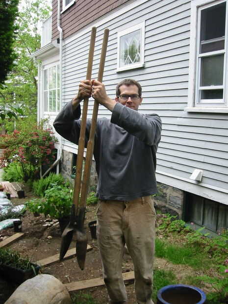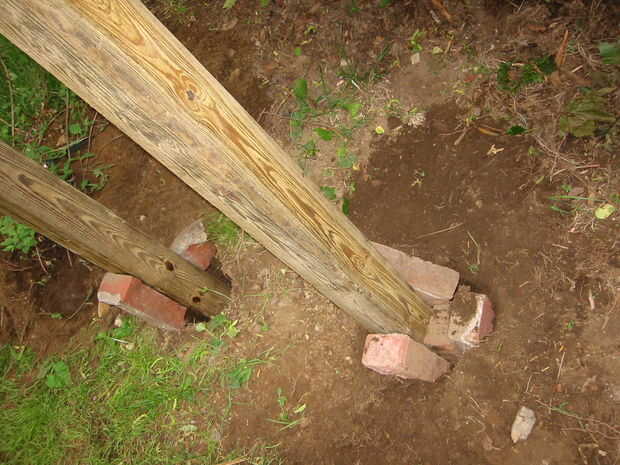 No estábamos que hábil con el cavador del agujero de poste, y los agujeros se hieren para arriba considerablemente más grande que nuestros posts. Por lo tanto, hemos insertado dos (izquierdo y derecho de la pareja delantera) y temporalmente se estabilizaron por rellenar los huecos en los agujeros de poste con piedras y ladrillos.