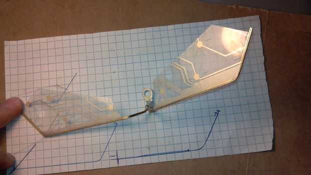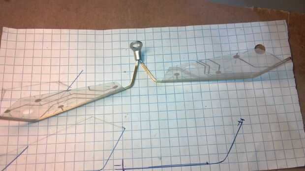 La forma más sencilla de empezar es con ojal de un cable. Doblar un poco hacia delante, (imagen montada sobre el centro o ligeramente hacia delante del centro superior. Utilizando tubería de latón cuadrado (cuadrado de 1/16 de pulgada), aproximadamente 4-7 pulgadas de largo, que doblan juntos al mismo tiempo ayudar a mantenerlas simétricas, gire ambos 90 grados (en direcciones opuestas), doblar otra vez... cuando se ven bien, soldarlos en el ojo del montaje. En las avispas más grandes, cada ala tiene su propio ojete y soporte al cuerpo. Una vez más, esto es donde trataría de integrar un buen disipador de calor. Y, por supuesto, las tuercas de mariposa! Diseñar un marco de ala en su material de ala, trazarlo, recórtalo. La película de teclado tiene una parte superior e inferior, hacer una copia espejo del patrón si su no simétrica. Super pegue el ala sobre el marco, con mucho cuidado - he desordenado de unos pocos con técnica descuidada cola! Si estás haciendo ribete negro, seguir adelante y pintar el ojete negro.