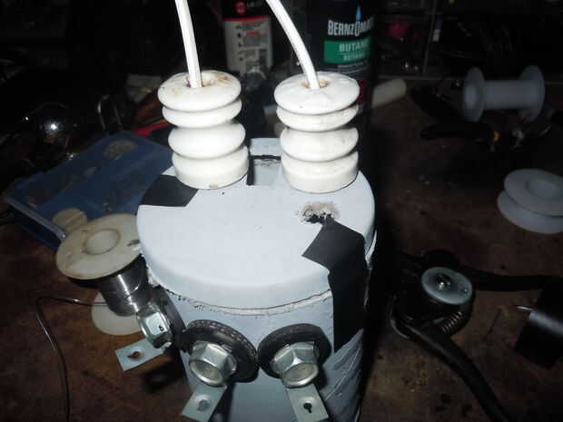 A continuación colocar los aisladores en los cables de entrada, en los transformadores reales están en un ligero ángulo usé alguna masilla de epoxy para fijar en la posición correcta.