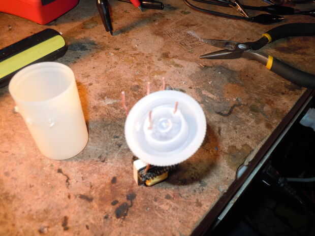 2" segmentos de alambre de cobre en cada salida de la soldadura, no tiene que ser aseado, tu no vas a verlo. Doblar los vientos primarios un poco más cerca o aparte para que a través de los agujeros en la tapa y lo mismo para el cartucho.