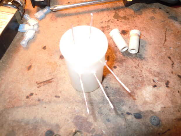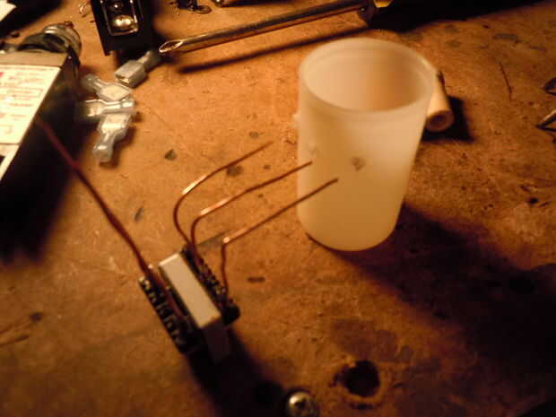 Ahora para la parte delicada, primero doblar los cables en ángulo recto para que estén a la misma altura en los tres agujeros. Empuje los cables en los agujeros desde el interior el cartucho hasta que hagan tope en ningún otro (puede tener usar alicates de punta para empujar los cables en los agujeros), ahora baje el transformador en el tambor.