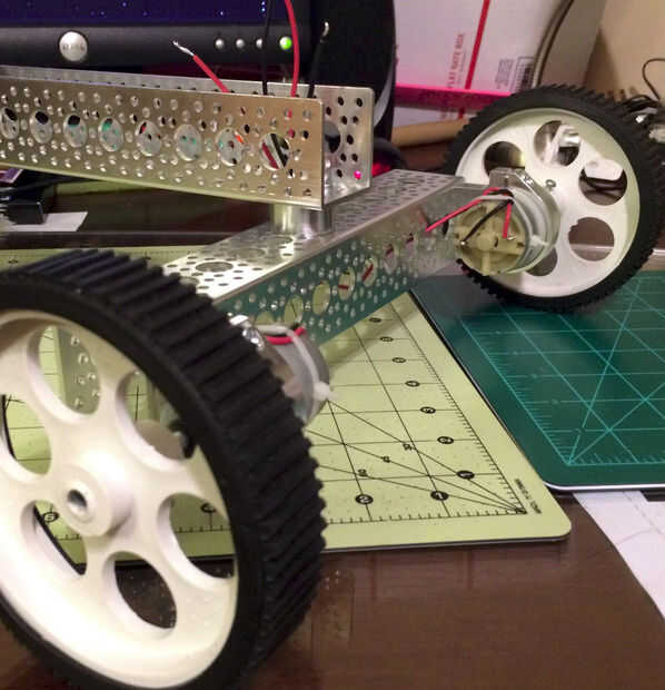 Una vez en los Montes, añadir los motores. Asegúrese de que son una distancia igual en el Monte en ambos motores. Posición de montaje como usted, asegurándose de que encajan correctamente y el bot va a conducir bien en esa posición. Después de eso, montar las ruedas en los motores. Las ruedas en la foto tienen un tornillo de fijación incorporado. Coloque el tornillo en el lado "plano" del eje del motor y seguro. Repita para otra rueda.