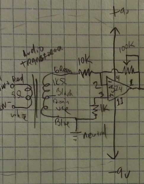 Conecte el alambre verde de transformadores a la resistencia de 10 k, luego conecte al pin 2 del LM324 y también un lado del comparador de. Entonces retroalimenta el comparador hacia atrás sobre sí mismo y a la clavija 1. Conecte el cable azul del transformador a tierra y a una 1 k resistencia, conecte la resistencia al pin 3. Finalmente conectar el pin 11 al lado negativo de una pila de nueve voltios y el lado positivo de la batería a tierra. Luego conectar el pin 4 en el lado positivo de una segunda batería de nueve voltios y luego conectar el negativo a tierra.