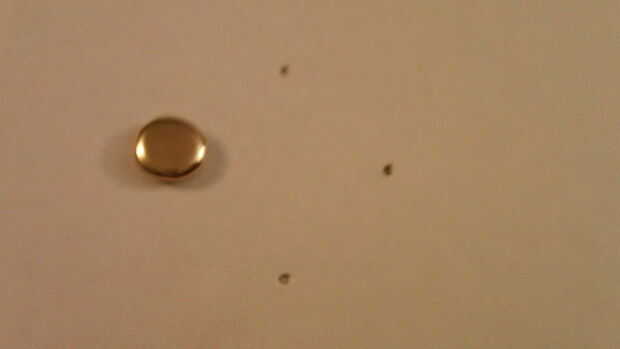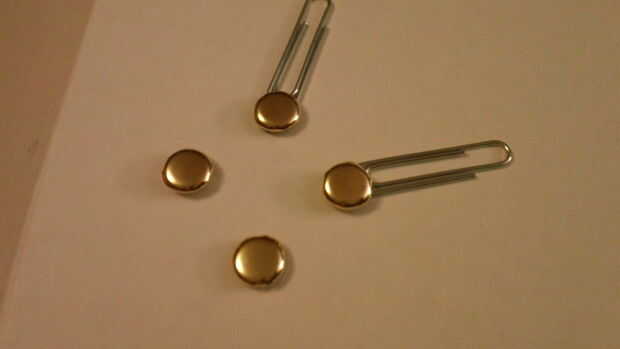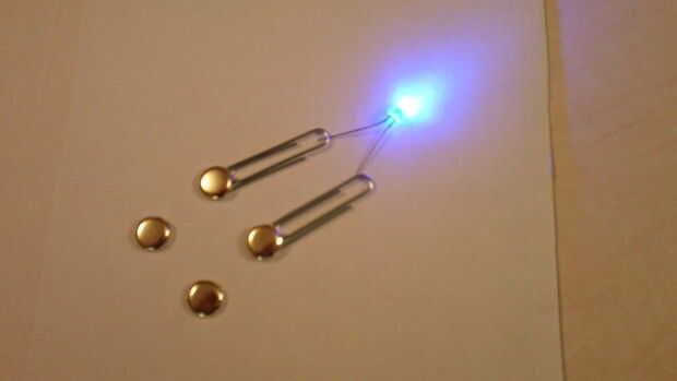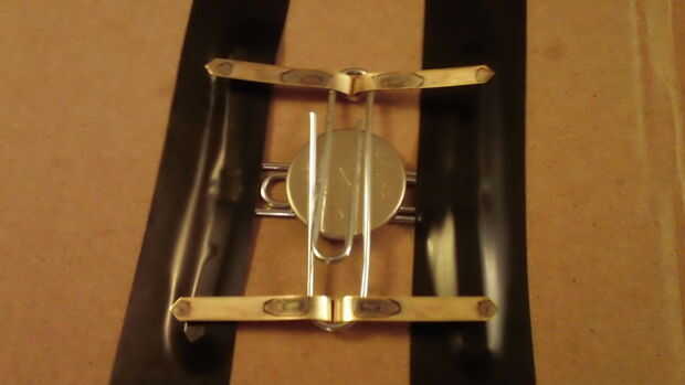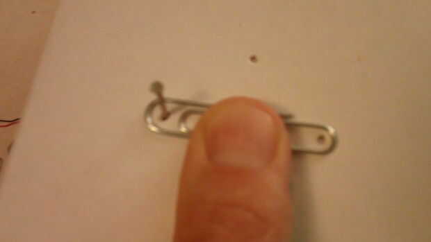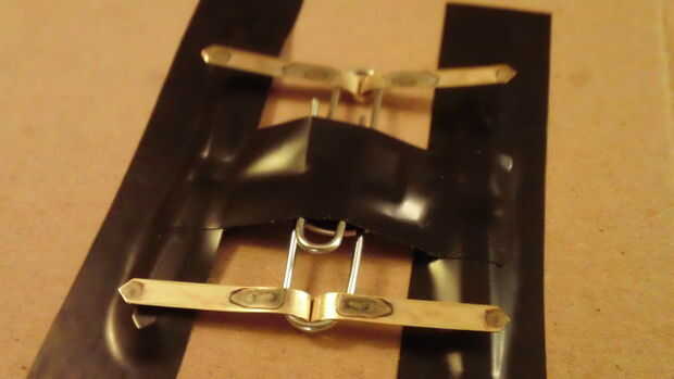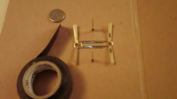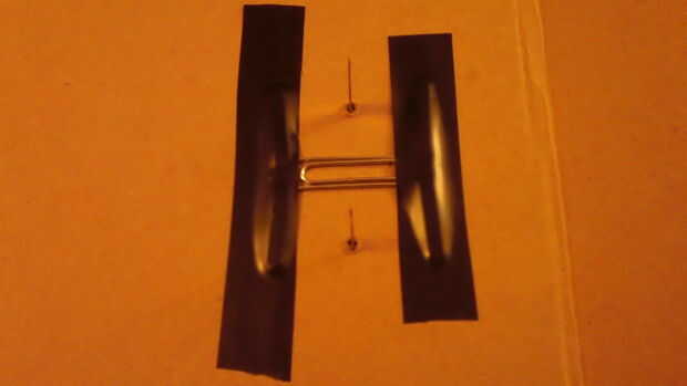 • Ahora en la parte posterior colocar un clip sobre los 2 clavitos y asegure por aplanar hacia fuera.  Se trata de la conexión negativa.  (ver foto)  Coloque cinta sobre las clavijas de brad.