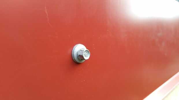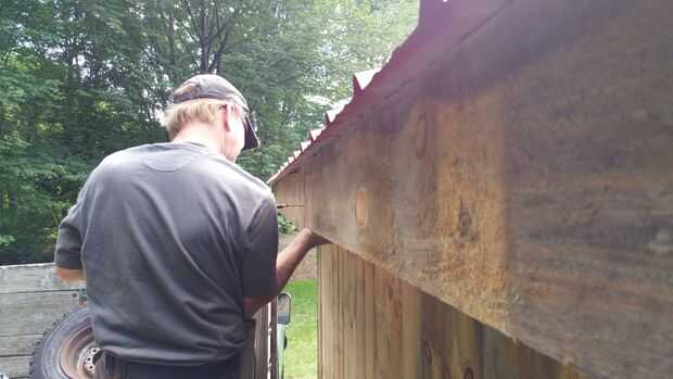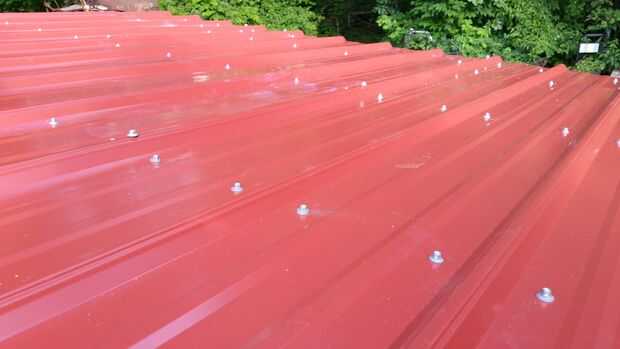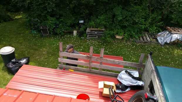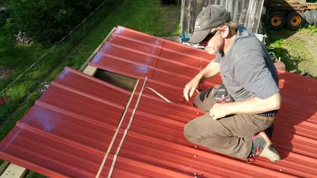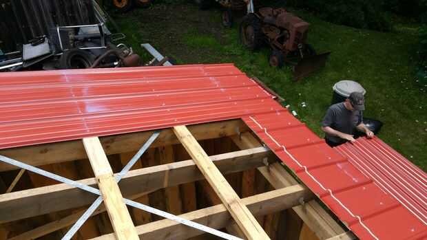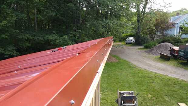 Los techos de metal pueden instalarse en muchos sentidos. Elegimos instalar en dos piezas para que pudiéramos quitar la parte de atrás que parte para hacer el camino de la vertiente jurídica. Por lo tanto compramos hojas de 8' y 3' 6" rojos techos de metal. La instalación es un poco complicada... tal vez usted se familiarice con una guía como esta para aprender cómo apretado que los tornillos y cómo se superponen a la dirección del viento en la mente. En todas las partes pero la parte delantera, hicimos el techo sobresale el borde tal que cualquier goteo de agua no vaya directamente a la moldura de madera. En el frente, se instalaron algunos ajuste de Aguilón para mantener el agua fuera de la Junta de compensación y una agradable banda roja a lo largo de la parte delantera de la nave. Otras cosas a destacar son que hacíamos cinta selladora la superposición en el impermeable de la cubierta, y hacíamos cierre la conexión entre el guarnecido del aguilón y el impermeable de la cubierta principal.