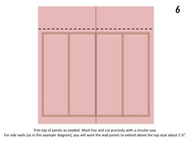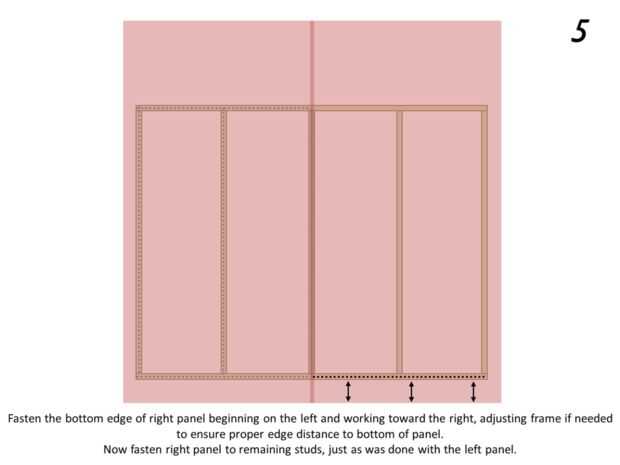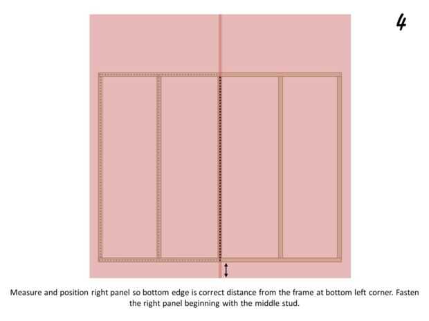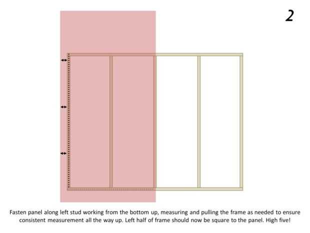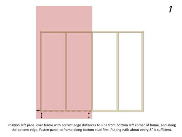 Puesto que los paneles de cortes son perfectamente cuadrados podemos utilizar esto para nuestro beneficio para extraer los marcos en perfecta escuadra así. Los paneles se fijan con clavos galvanizados exteriores según el orden y las indicaciones de los diagramas que he compartido aquí.