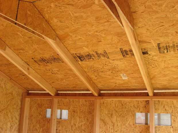 Dos hojas de 7/16" OSB fueron sujetadas a las cerchas con tornillos (aproximadamente cada 8 pulgadas) asegurándose de que las armaduras eran verticales.