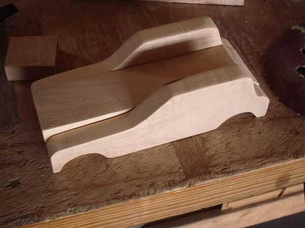Después de transcurrido suficiente tiempo, quite las abrazaderas de las tablas que ahora se pegan. Coloque el tablero de visión lateral del coche justo al lado de los dos tableros solo pegados juntos (o no porque ellos no fueron curvados). Después de que las piezas estén alineadas de la forma que desee, traza la curvatura de la parte trasera del coche contra las tablas pegadas (o no pegadas). Dejar la parte delantera del coche sin trazabilidad. Corte su rastro con su sierra de banda y las tablas de arena para que alinee con el cuerpo del coche. Ligeramente alrededor de campana el coche con papel de lija.