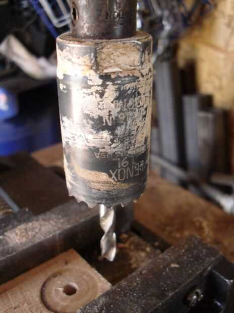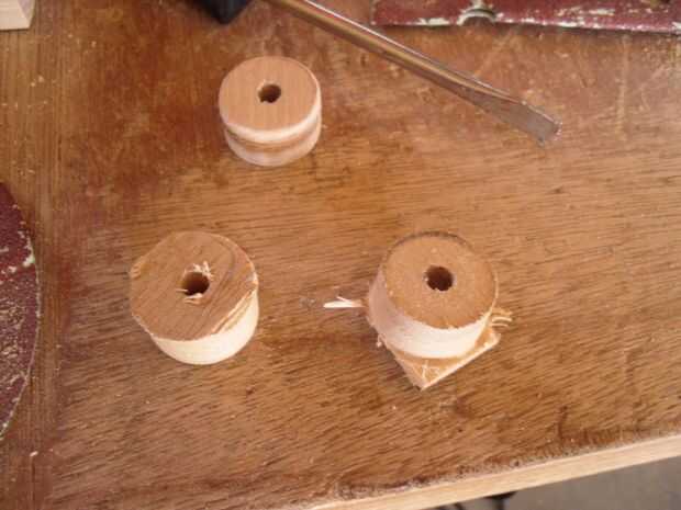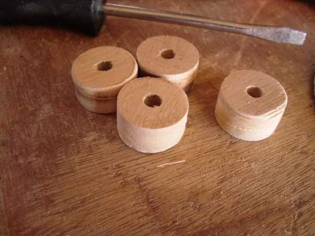 Ahora es el momento para cortar las cuatro ruedas que se utilizará. La plantilla, estos discos serán 1" diámetro con el eje ser un orificio de 1/4". Usé una sierra broca de un taladro para perforar a las ruedas. La última parte de la rueda lentamente para evitar el astillado como lo que se ve en la segunda foto del taladro. Estas astillas pueden limpiarse con la Sierra de cinta y lijar.