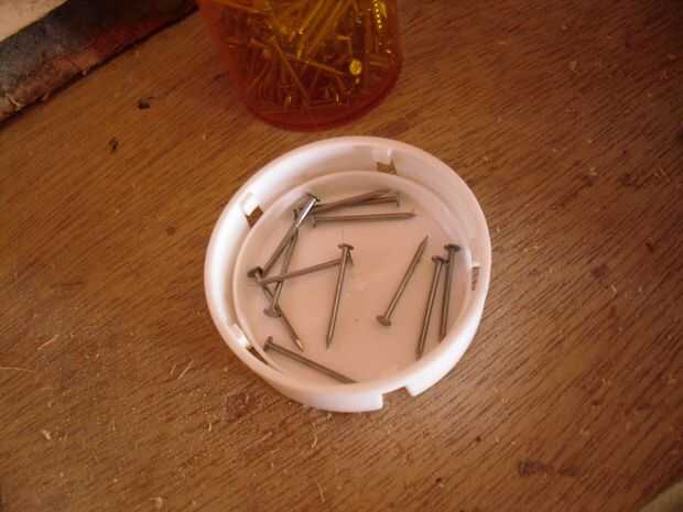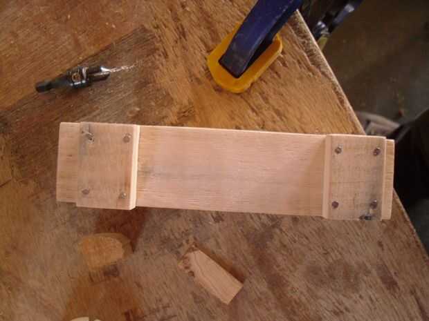 Los orificios deben colocarse por lo tanto para que las uñas no choquen las cabezas de los tornillos de la mampostería seca a continuación. Proceder a pegar y clavar los soportes del eje en su lugar. Asegúrese de que se colocan en el lugar correcto en su vista lateral. Mina deslizó un poco haciendo las ruedas mirada, aunque todavía muy bien la vuelta.