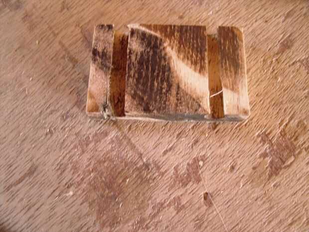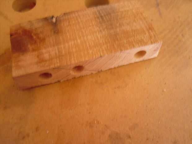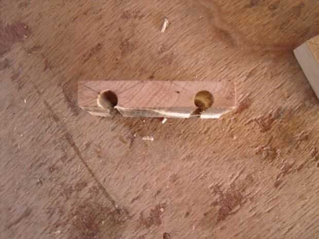 Las últimas piezas del rompecabezas son los componentes que se asegure el eje del cuerpo del coche. Para hacerlos, me corte una tira ancha de 1-1/2" de madera y dos 5/16" los orificios perforados, lo suficientemente grandes como para permitir un pequeño meneo del eje. Estos agujeros se centraron en el final de la madera.