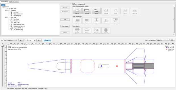 El uso más importante de software como esta es en la determinación de la estabilidad. Idealmente, la estabilidad del cohete debe estar entre 1 y 2 de cal. Una estabilidad de un calibre significa que el centro de gravedad es 1 diámetro del cuerpo delante del centro de presión, o aproximadamente 4 pulgadas de esta rocket. Estabilidad a menos de 1 cal puede tener resultados peligrosos y desastrosos, por lo general termina en un duro aterrizaje de desplome. Márgenes de estabilidad más 2 cal están bien, aunque el cohete puede mostrar algunas formas extrañas de movimiento, particularmente en días de viento.