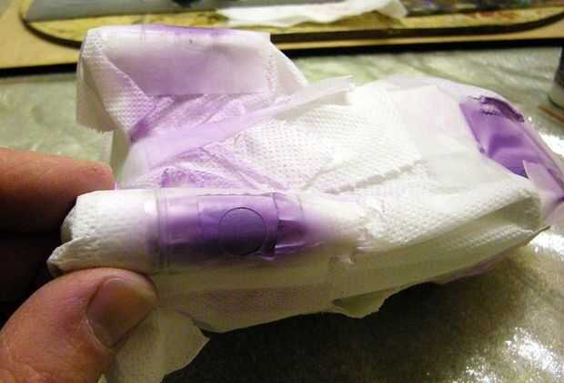 Una vez que se había secado la púrpura, apliqué el siguiente nivel de máscaras y rociado con pintura negra. Lamentablemente fue un poco más entusiastico o probablemente debería haber aplicado la pintura un poco más lenta. Sangrado debajo de la máscara en lugares y así terminé tocándola para arriba con un cepillo a mano.