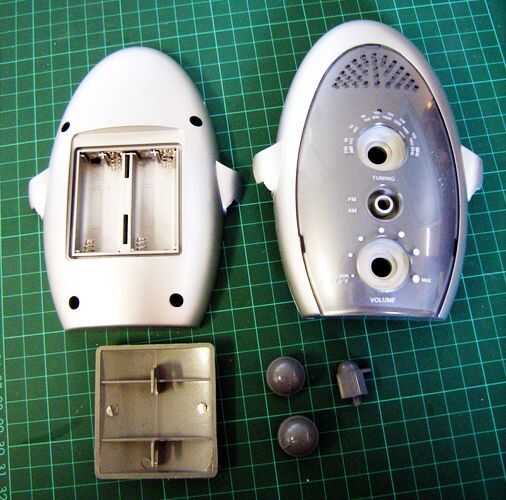 Despojado de la radio y desechar el funcionamiento interno. Las tres perillas se vertieron en la caja de brocas y pegué el caso detrás juntos otra vez. Como se puede ver, el compartimento de la batería hace una escotilla de carga de la idea.