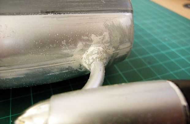 Una vez que los motores de dos laterales estaban en su lugar (el motor superior quedó apagado mientras que fue aprobado lo que estaba haciendo con esa parte del modelo) llené y lijar las juntas. No creo que el redondo curvado barra que admite el motor aspecto substancial bastante para mi gusto así que decidí añadir una aleta en detrás de la barra. No es una tarea fácil, ya que hay cuatro diferentes superficies que debían encajar perfectamente curvadas. Comencé cortando patrones de papel para trabajar de.