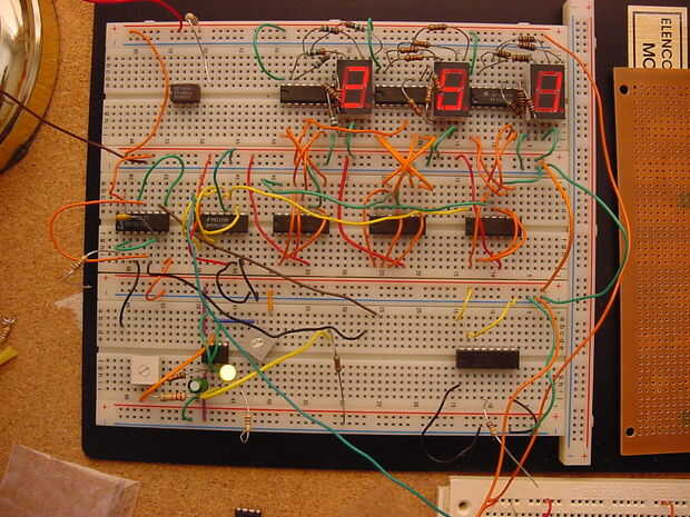 Antes de comprar todos los recipientes, conectores etc., protoboard este proyecto para asegurarse de que usted puede conseguir el contador y el funcionamiento de la pantalla. Esto se remonta a la declaración en el primer paso, asegúrese de que usted tiene las habilidades para hacerlo y conseguir trabajo en un protoboard es una manera realmente buena para poner a prueba esa teoría.