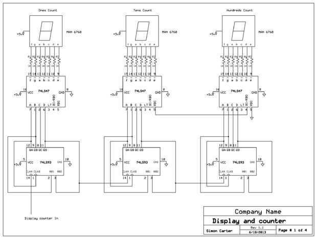 En el primer esquema ves el contador de la exhibición. El contador de miles y la pantalla no se muestra porque no había espacio en el dibujo, pero solo repites el circuito una vez más, como ves cada sección 1, 10, 100, 1000 es idéntico. Se puede construir como se muestra y se cuenta a 999 o añadir otra sección contar hasta 9999.