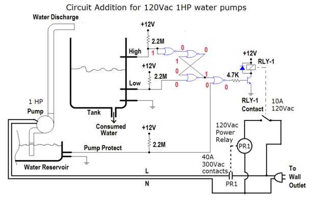 Para encender bombas de 240Vac, sería necesario un relé con dos conjuntos de contactos tales como automatización directa número AD-PR40-2A-120A. La bobina de este relé es también clasificada en 120 VCA para que nuestro control de nivel del agua puede cambiar de encendido/apagado en el voltaje clasificado. El segundo esquema muestra cómo puede conectarse una bomba de hasta 2HP para su correcto funcionamiento.