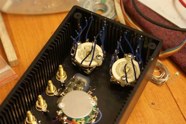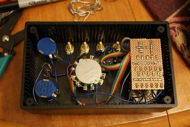 Utilicé cable de cinta del arco iris de seis conductores para la soldadura de los interruptores rotatorios a la placa de circuito que utilicé para los condensadores. Esto le da más flexibilidad y mantiene el cableado más fácil de manejar.