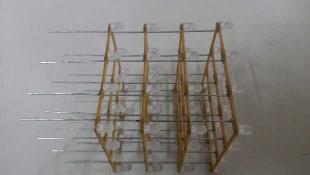 Vamos a empezar con 2 cables en esquinas diagonales. A continuación, poner la segunda capa en 2 cables utilizo una pierna de LED como un espaciador (ver foto) entre capas. El segundo plano de la soldadura.