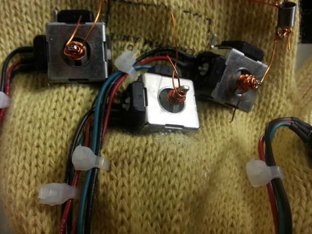 Colóquese el guante y utilice un rotulador para marcar donde quieres las macetas. Asegúrese de que tener el espacio por lo que no funciona en uno a pero todavía están alineados con el dedo. Se puede ver en mi guante que tenía que alternar para que se ajuste. Usé pegamento caliente para fijar el guante. Si el guante es ajustada, puede ser todo lo que necesitas. Si está flojo como mina, debe calzarse el guante después de pegar hacia abajo de las macetas y usar otro dedo para tire de la palanca de mando hacia abajo y ver si se mueve el bote entero. Si el bote se levanta y estira el material del guante, puede manojo de algún material de guante detrás de la maceta y pegar a la superficie trasera de la olla. Esto es básicamente eliminar sobrante del guante para que el guante de sí mismo no es actuar como un resorte y doblando un poquito el dedo se dobla la palanca de mando un poquito en vez de levantar el pote sin doblar la palanca de mando.