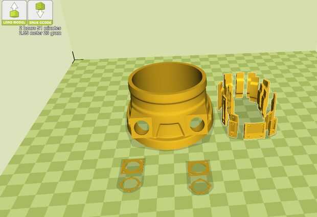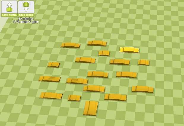 Si usted está teniendo dificultad para imprimir listones debido a su altura y la pequeña superficie de contacto con la cama de impresión, puede tratar de poner sobre la cama de impresión e imprimirlos con soportes. El tema con los listones que plano tiene los agujeros pequeños hemisferios que necesitarán soporte impreso para ellos. He cuidado de hacer todos los listones sobre la cama de impresión, así que usted puede imprimir el archivo de tablillas flat.stl en lugar del archivo slats.stl . No es necesario imprimir ambos archivos!