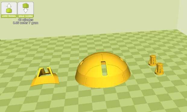 Para la cabeza, imprimir el archivo dome.stl junto con el cowl.stl que va en la ranura para los ojos de lo dalek. Finalmente, imprimir dos light.stl, preferiblemente en un filamento transparente que luego pintar en plata las piezas levantadas.