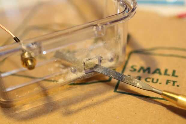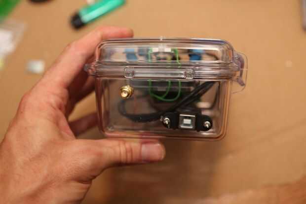 Mida y haga caso para aceptar breakout y antena adaptador. Perforar al menos un pequeño agujero en la parte superior e inferior para ventilar el sensor de presión y temperatura. Perfore otro agujero si va a montar la olla / botón. Un archivo plano que ayudan a hacer el agujero cuadrado para el arranque de la usb.