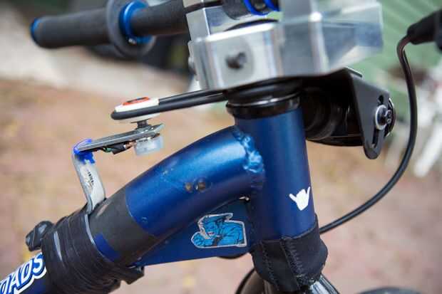 Montar el potenciómetro con una polea en la pila del auricular o columna de dirección. Botón montaje maneta de freno o el pedal para que espalda 'martillo' de la palanca golpea cuando suelta el botón y botón no impide el uso del freno.