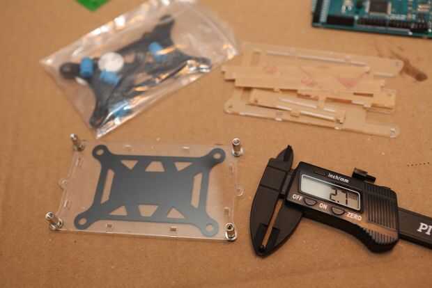 Armar el caso de Arduino y la montura anti-vibración y luego atarlos juntos. Separadores de plástico solía fijar los dos soportes y poner otro juego de separadores en la placa anti vibraciones para después montarlo en el interior de la caja.