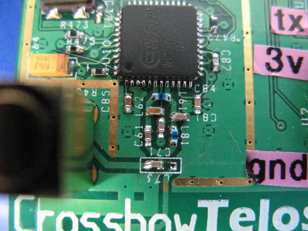 Para utilizar una antena externa, tienes que mover un pequeño condensador en la placa TelosB. La segunda imagen muestra una placa sin modificar y la tercera imagen muestra el condensador movido. Se pueden hacer usando un soldador normal y calefacción para arriba de ambos lados del capacitor, luego agarrar con pinzas. Es más fácil de hacer usando una herramienta de aire caliente.