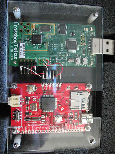Otro ejemplo con el mismo acrílico de 1/8 de pulgada se muestra a continuación (rojo Sparkfun Logomatic tablero conectado a un TelosB diferentes.) Procesador y titular de la tarjeta SD el Logomatic están al mismo nivel, por lo que su construcción era más simple que la Mega + escudo + TelosB.